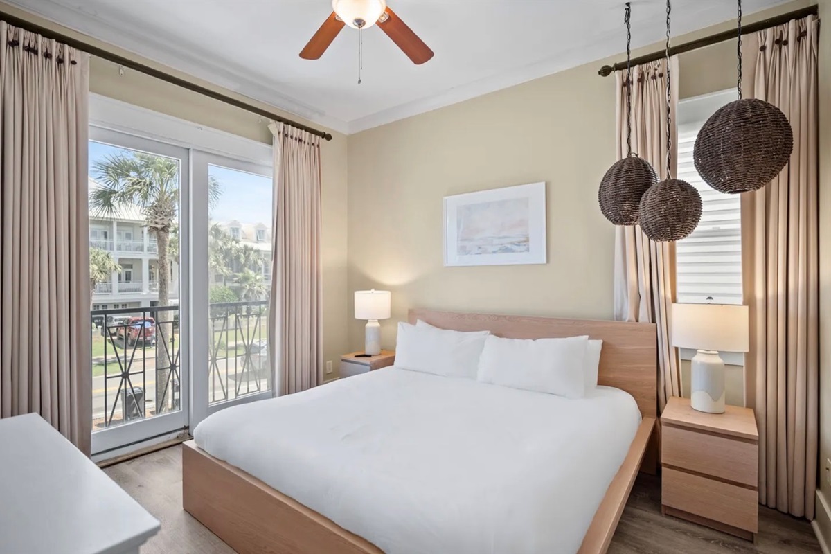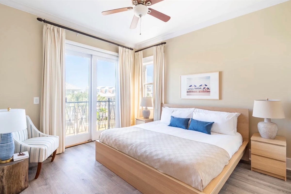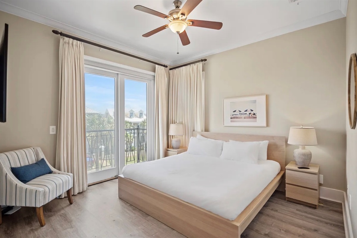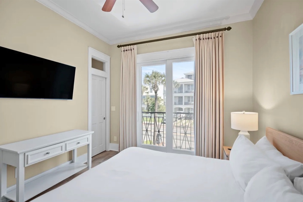 ✹ SECOND FLOOR - Bedroom 3: KING bed, full bathroom in hall with walk in shower, balcony overlooking Frangista Beach neighborhood, Smart TV (Sleeps 2)