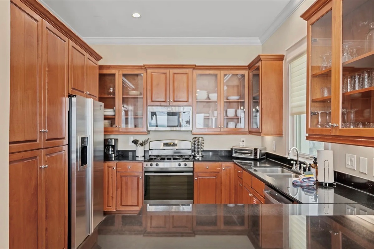 ✹ A fully stocked kitchen with plenty of pots, pans, cooking eating materials, Tupperware, Ziploc bags, tin foil, and coffee/tea bar