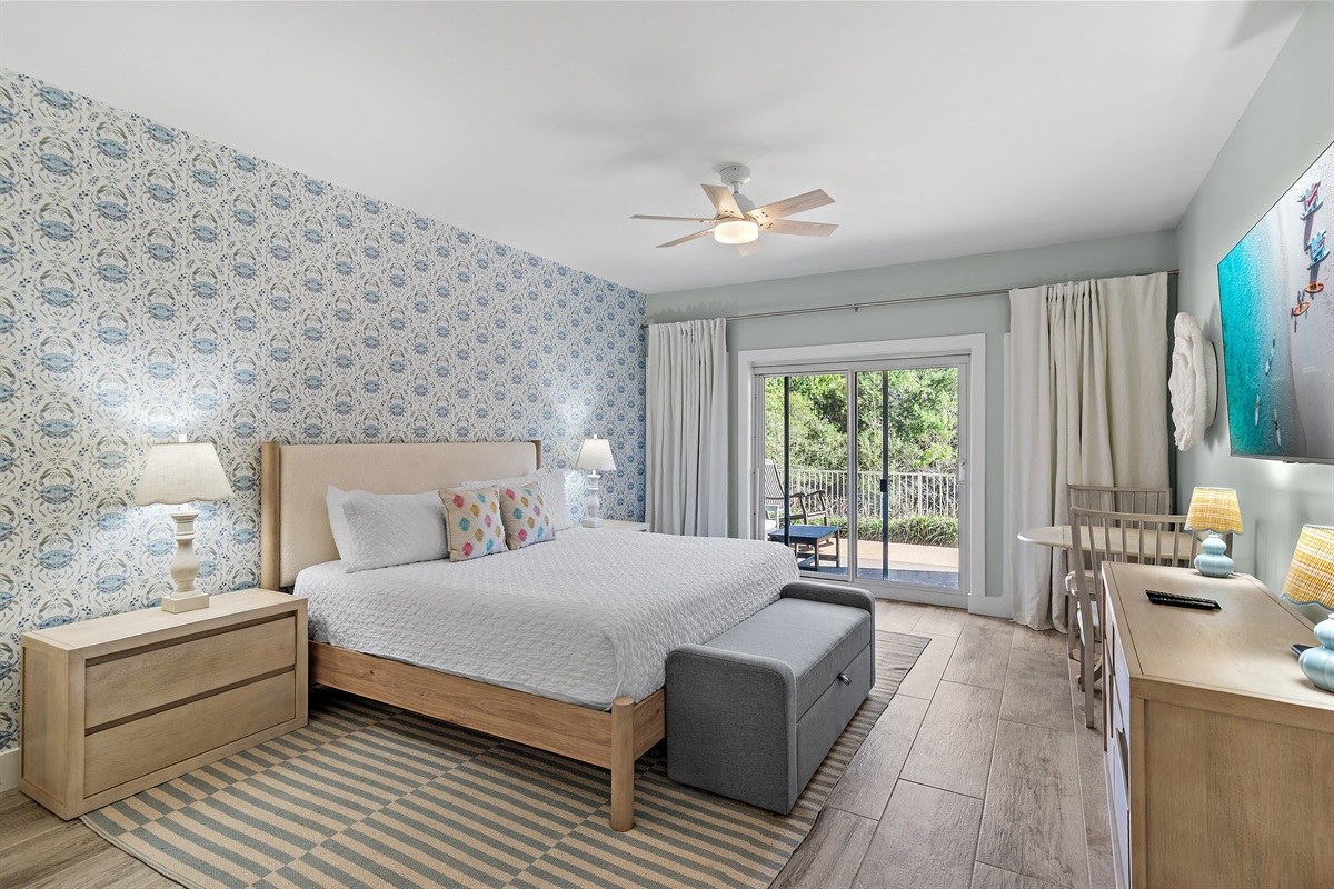 • King Bed, Smart TV, Sitting Area, and Private Patio